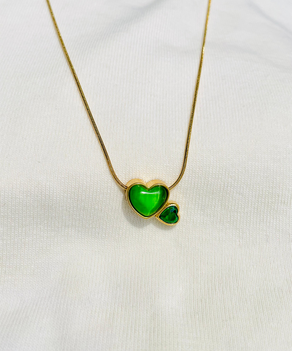 Celebrate love, connection, and elegance with our Emerald Twin Heart Pendant. Featuring two vibrant green heart-shaped stones—one larger and one smaller—this pendant symbolizes affection, growth, and unity. Set in a sleek gold-tone frame and suspended on a fine anti-tarnish chain, it’s a timeless piece for any occasion.